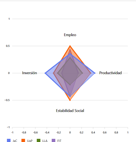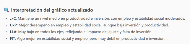 Sumado a esto comparto un análisis de cómo ve la IA a los principales espacios nacionales en base a cuatro ejes: Empleo, Inversión, Estabilidad Social y Productividad. En base a datos reales, la IA generó el siguiente cuadro comparativo, en donde la LLA es la peor opción y donde JXC, dentro de los espacios que se proponen, es la más conveniente en base a sus propuestas reales proyectada en estas variables económicas-sociales.