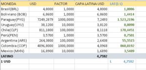Esta Moneda de Estabilización, Latina V2, que incluye en su calculo los países más importantes de Latinoamerica , tendrá como principal objetivo, reducir la inflación, y evitar la pérdida de poder adquisitivo de los salarios, además permitir que las empresas y comercios, y demás, no pierdan su capital y ganancias, ni tampoco tengan que comprar usd, euros y otros, comprometiendo las reservas del país. La monedad Latina, será una moneda virtual, que cotizará de acuerdo al tipo de cambio de 9 países de Latinoamerica frente al USD (Argentina, Mexico, Colombia, Perú, Chile, Paraguay, Brasil, Bolivia y Uruguay) . El calculo de la misma surge del promedio de las cotización de las monedas de los paises enumerados frente al USD. Debajo detallamos un ejemplo a la cotización del día 14/07/2023, donde 1 USD = 4,75 LAT.